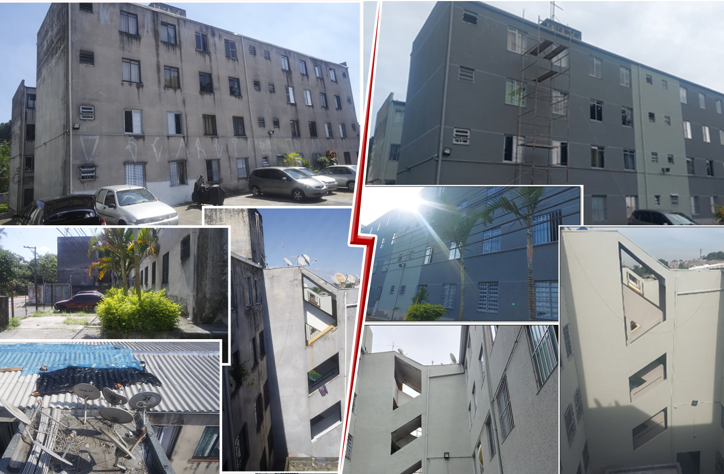 Na etapa de intervenção, a Vertical Projetos conduziu a supervisão e acompanhamento integral das obras de recuperação estrutural, abrangendo a reabilitação das estruturas das escadas, pintura e revitalização das fachadas, e a execução de revestimento em ardósia no entorno do empreendimento.