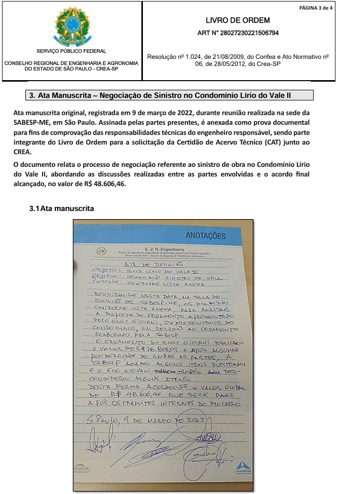 O conjunto de atividades foi formalmente registrado no CREA-SP por meio da ART nº 28027230221506794, com emissão de Certidão de Acervo Técnico – CAT nº 2620250017505